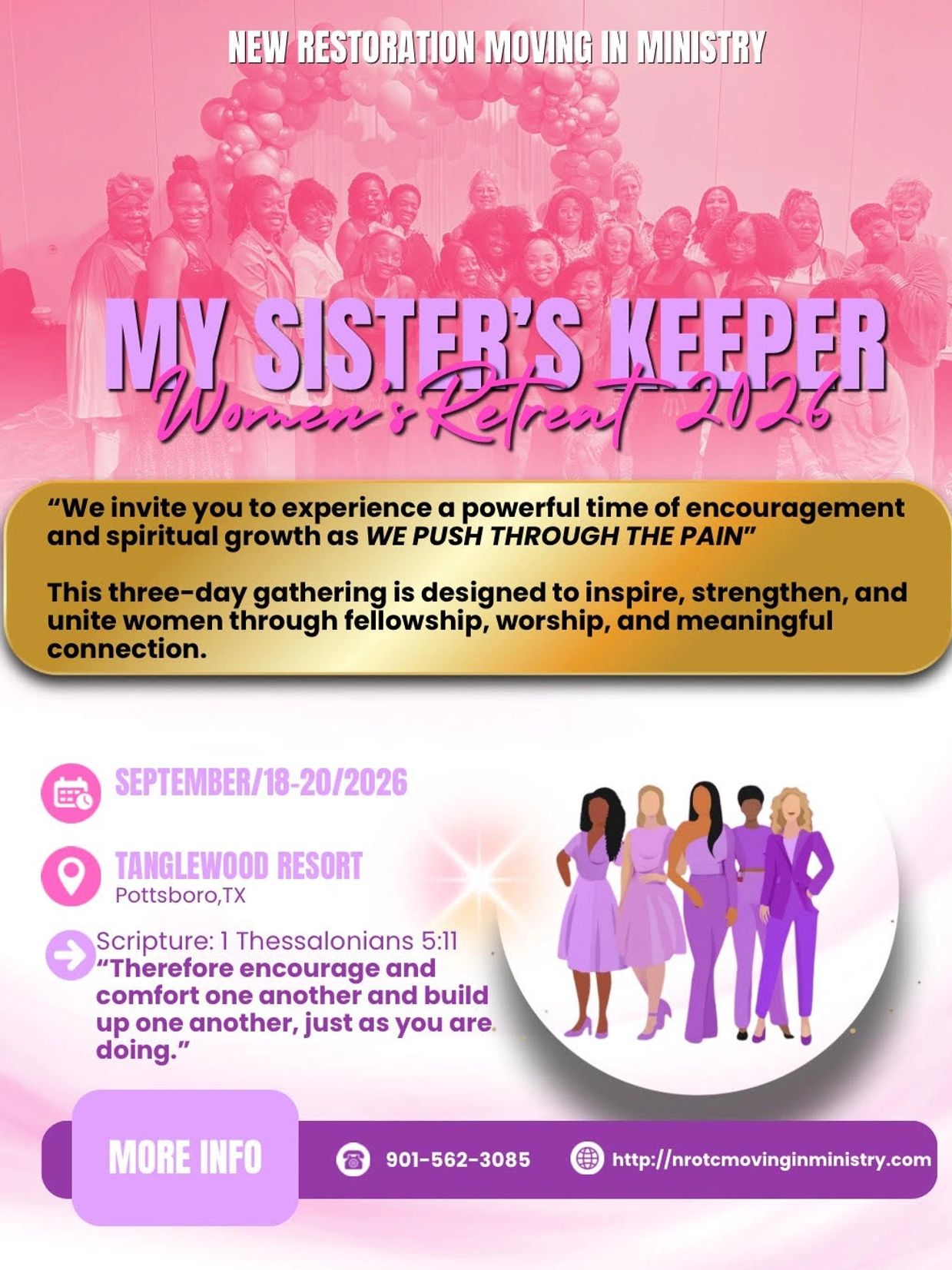 Join Apostle Deneatrice Millner and her team for the fourth annual My Sisters' Keeper Women's Retreat—a transformative weekend of healing, breakthrough, and divine connection! This year’s retreat will be held September 18-20, 2026, at the peaceful Tanglewood Resort in Pottsboro, Texas. Our theme, “Pushing Through the Pain,” is a call for women to rise above life's challenges and walk boldly into healing and restoration through Christ Jesus.